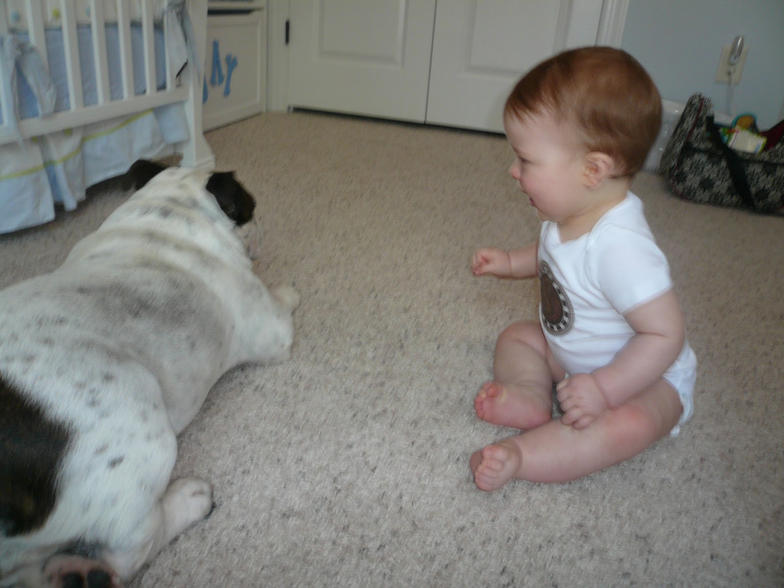 As for life at 8 months, things are pretty steady. He is cutting 4 teeth on top (his first top tooth erupted Monday night, then there are 3 more that are about to come through any second.) So, after nearly 5 months with no more action in the tooth department here come 4 at once. You will note that Sophie has become our closest ally in the battle against achy gums. Jay has only woken up in the night twice with this issue and has napped more some days and less some days. I do not claim to have any explanation for this.